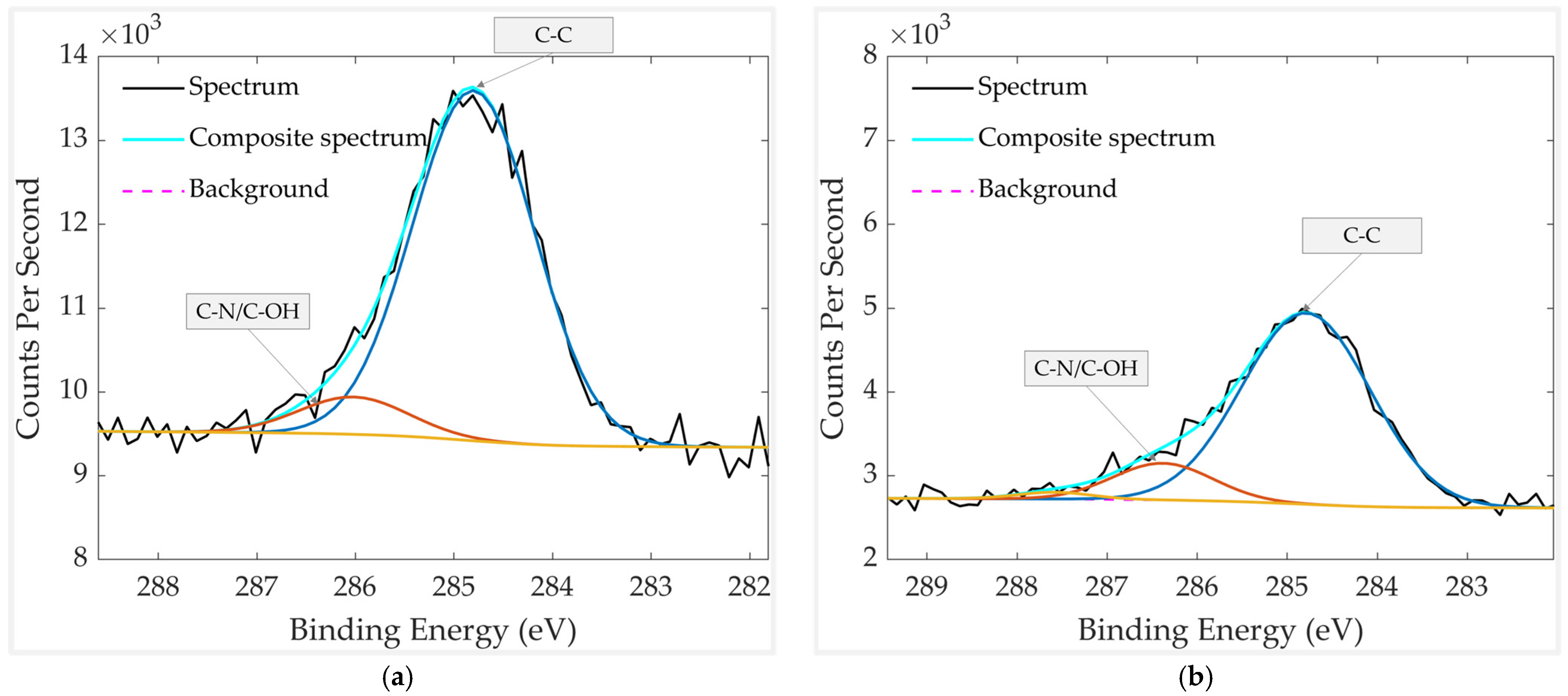The comparison of the chemical states of C 1s is presented in Figure 10. In the aged sample without thermal treatment (Figure 10a), high-resolution C 1s fitting reveals three main components at 284.3 eV, 285.7 eV, and 288.0 eV, corresponding to C–C, C–OH/C–N, and C=O/C=N species, respectively. The presence of multiple oxygen- and nitrogen-containing carbon bonds indicates surface contamination by organic residues and absorbed molecules. In contrast, after thermal treatment (Figure 10b), the spectrum contains only two detectable components at 284.8 eV (C–C) and 286.3 eV (C–OH/C–N). The second peak intensity decreases while the C=O/C=N peak at 288.0 eV nearly disappears, confirming the effective removal of oxidized carbon species during heating. The substantial reduction of oxygenated and nitrogen-containing carbon is consistent with the almost disappearance of N 1s in the spectrum of the heated sample (Figure 7b, Table 2), supporting thermal decomposition or desorption of heterocyclic contaminants such as pyridine- or quinoline-like molecules.