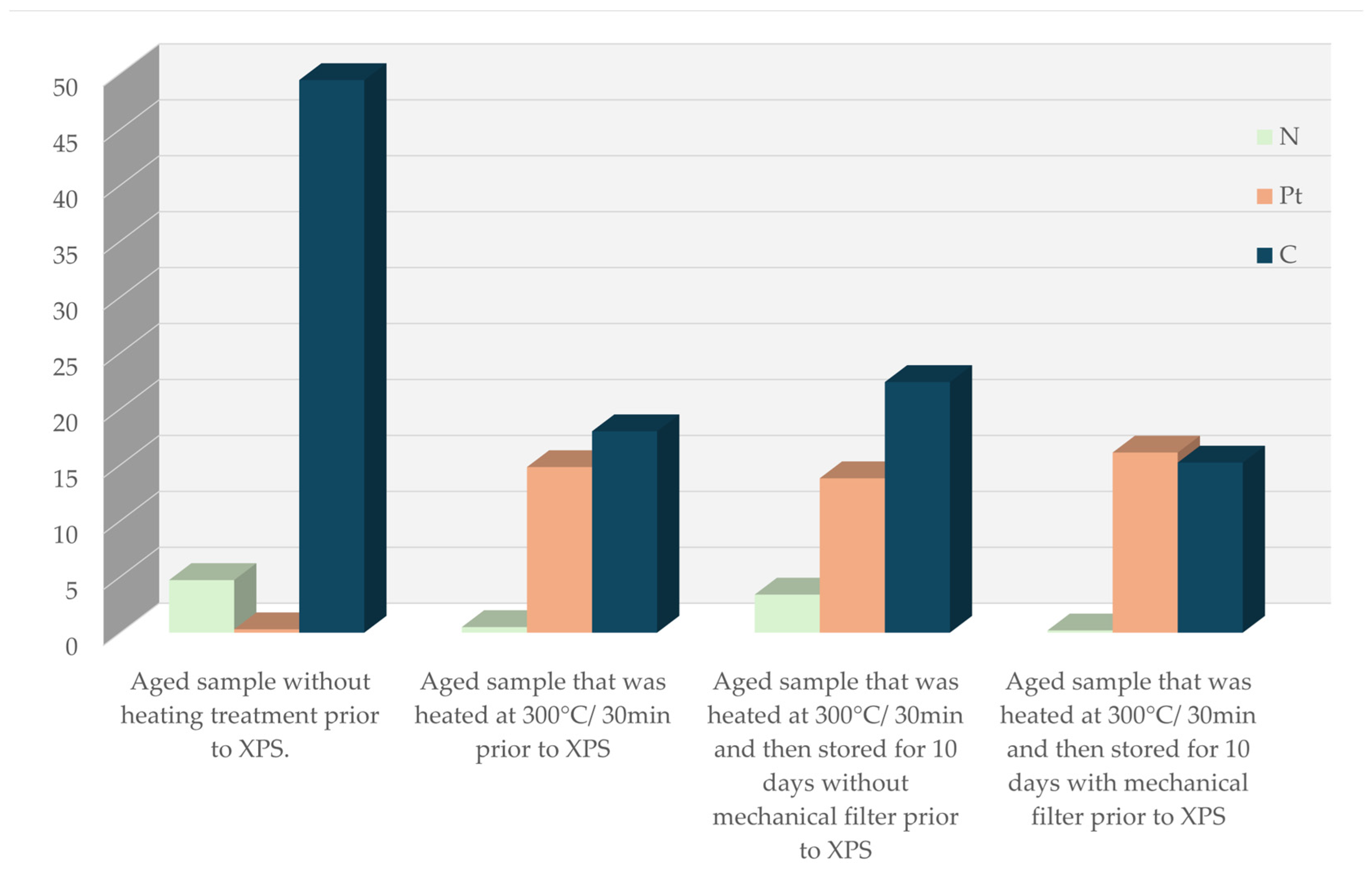 The initial assumption guiding this study was that the fresh, unaged device would exhibit the cleanest catalytic surface, consisting predominantly of exposed metallic Pt with minimal contamination. By contrast, aged samples stored under ambient conditions were expected to accumulate adventitious carbon and oxygen-containing species, reducing Pt visibility in XPS. Thermal treatment was anticipated to remove a significant portion of this surface contamination, whereas filtration during storage was expected to limit re-adsorption of airborne hydrocarbons and oxidizing species. The results obtained from SEM, EDX, and XPS confirm this expectation.