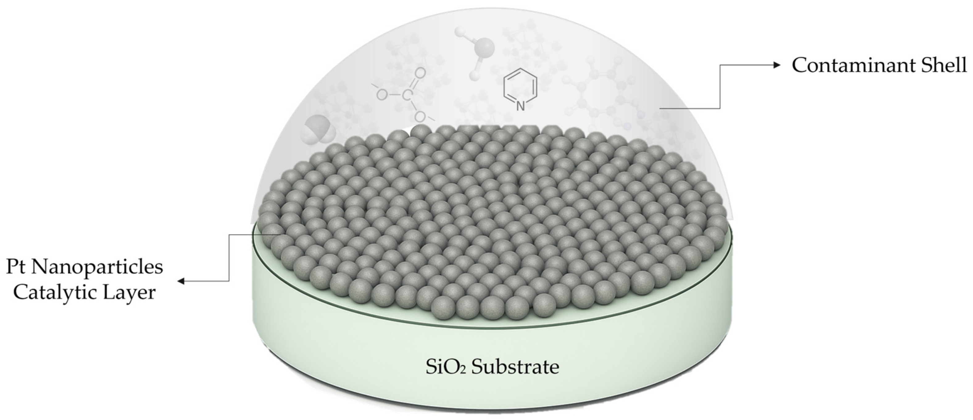 The reported research was mainly concentrated on catalyst deactivation during the operation of sensors. In contrast, in our paper, we are focusing on Pt nanoparticle catalyst contamination during storage in the open air at room temperature because these are the conditions related to the air quality control sensors. We used a Pt nanoparticle catalyst deposited from Pt-NP ink as a promising material for catalyst printing in the mass production of cheap gas sensors.