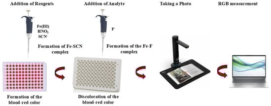 The experimental steps of the analytical methodology require minimal technical expertise and non-specialized instrumentation and are depicted in the following scheme (Figure 1). In brief, small volumes of deionized water, HNO3 solution (60 µL, 1.0 mmol L−1), Fe(III) solution (10 µL, 0.6 mmol L−1), and SCN− solution (60 µL, 20 mmol L−1) were added to the plate cells successively to form the stable, brightly colored [Fe(SCN)]2+ complex, and fluoride ions were added to diminish the blood-red colored complex. For the blank samples, deionized water was used instead of F−. After the reaction was completed in under one minute, the cells in the 96-well plate were photographed using a flatbed scanner and saved as JPEG files on a laptop computer, as depicted in Figure 1. The increase or fading of the color was then measured using the ImageJ (Version 1.53.k) program, both in the overall color area and in the red area, using the RGB function with a circular selection pattern, and the results were placed into an Excel sheet.