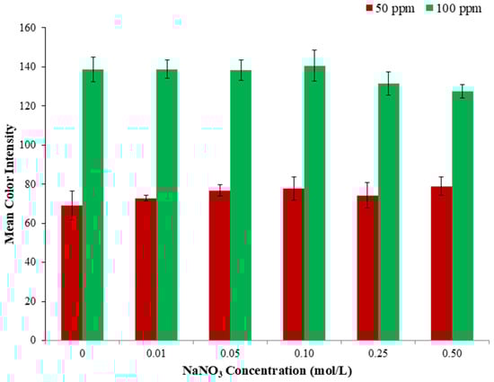 Ionic strength occasionally affects the formation and stability of complexes and the robustness of analytical methods, regarding the spectrophotometric evaluation of the Fe(III)-SCN complex [31]. Therefore, the effect of ionic strength was considered an important parameter to study. Different concentrations of NaNO3 solutions (from 0.01 to 0.50 mol L−1), obtained by dilution from the initial solution (2.0 mol L−1) (stock), were added into the wells of the plate. Specifically, no significant change is observed in Figure 3, for the first three NaNO3 concentrations (color alteration ranging from −0.2 to 1.4% relative error). In comparison, at the two higher salt concentrations, a small decrease was observed (−5.1 and −8.0% relative error, respectively). Thus, no salt addition was selected for the upcoming experiments.