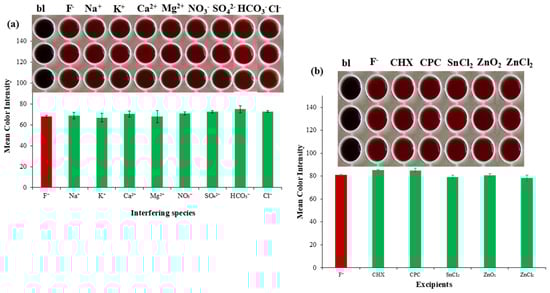 Selectivity study for the colorimetric determination of fluoride ions vs. (a) most common ions present in surface water samples, and (b) the excipients present in oral hygiene products.