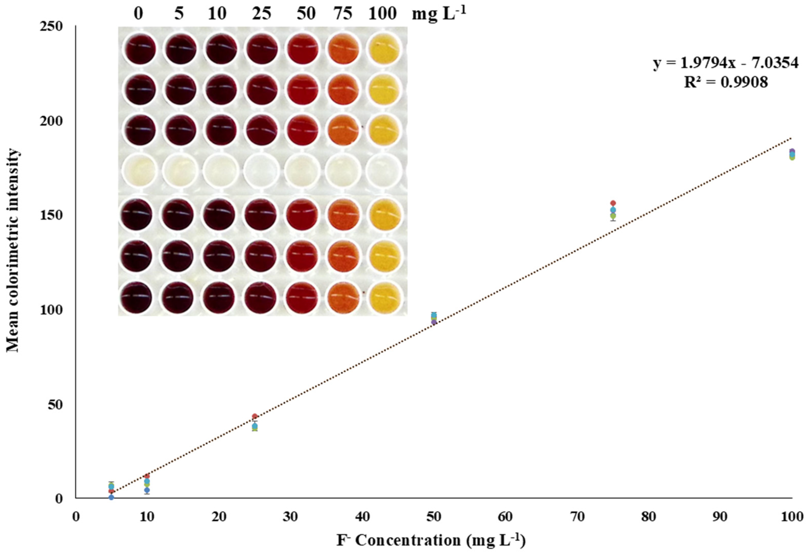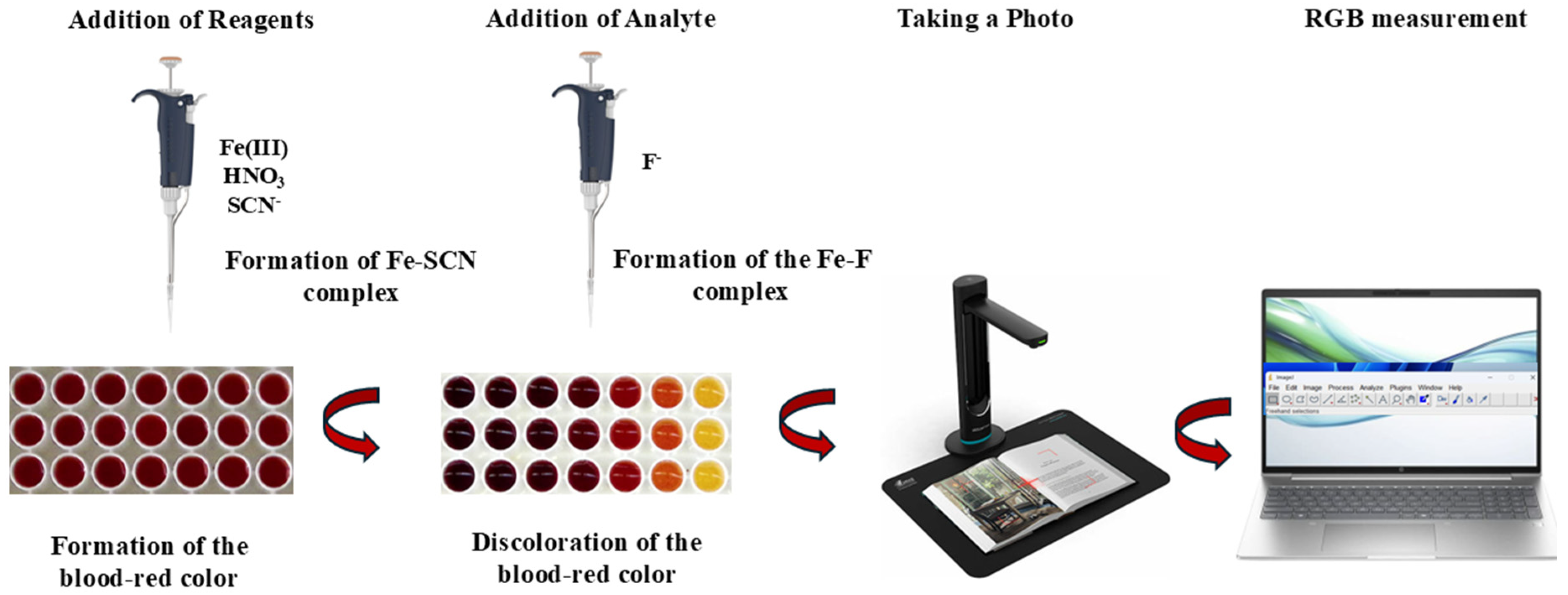 - Mukherjee, S.; Shah, M.; Chaudhari, K.; Jana, A.; Sudhakar, C.; Srikrishnarka, P.; Islam, M.R.; Philip, L.; Pradeep, T. Smartphone-based fluoride-specific sensor for rapid and affordable colorimetric detection and precise quantification at sub-ppm levels for field applications. ACS Omega 2020, 5, 25253–25263. [Google Scholar] [CrossRef] [PubMed]