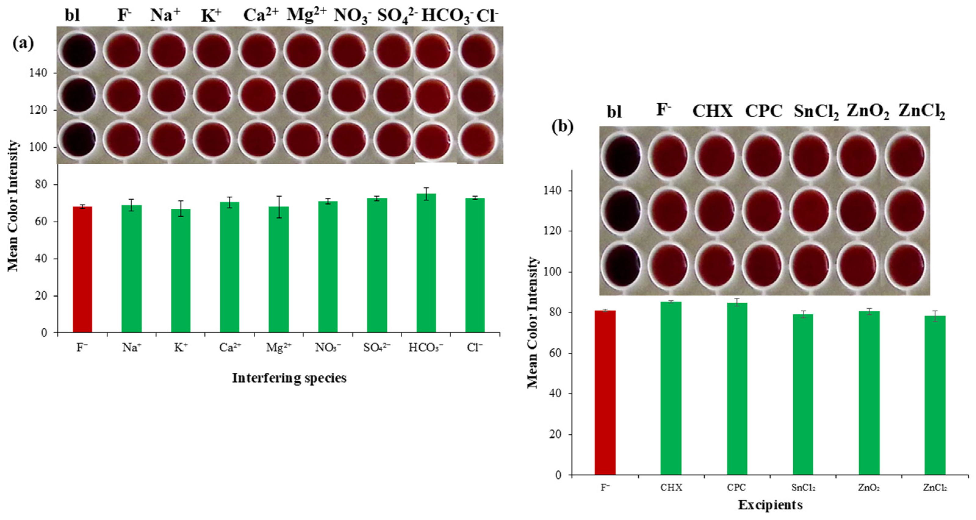 - Themelis, D.G.; Tzanavaras, P.D. Simultaneous spectrophotometric determination of fluoride and monofluorophosphate ions in toothpastes using a reversed flow injection manifold. Anal. Chim. Acta 2001, 429, 111–116. [Google Scholar] [CrossRef]