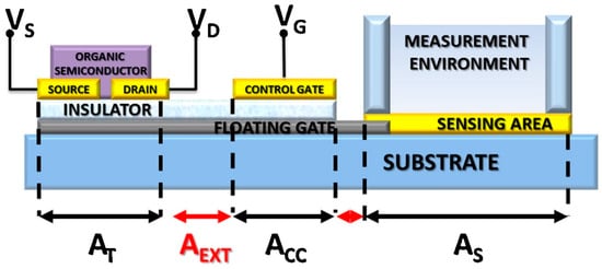 Schematic illustration of a floating-gate OFET architecture. The total floating-gate area (ATOT) comprises the transistor area (AT), the control capacitor area (ACC), and the sensing area (AS), along with the interconnecting extensions (AEXT). Tailoring these geometric contributions enables optimization of the sensing performance of OFET-based biosensors. (Reproduced with permission from [39]).