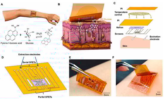 (A) Operating principle of OFET-based glucose sensors utilizing boronic acid. (B,C) Schematic representation of the detection system. (D) Structural design enabling a wide linear detection range for glucose. (E,F) Photographic images of the fabricated device. (Reproduced with permission from [49]).