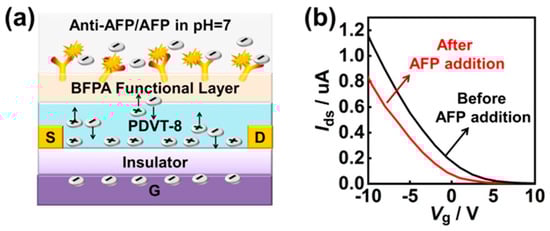 Schematic representation of the OFET-based biosensor mechanism. (a) Model illustrating immune detection of the AFP biomarker diluted in 1× PBS at pH 7. (b) Variations in Ids and Vth electrical signals in response to 1 μg/mL AFP biomarker. (Reproduced with permission from [58]).