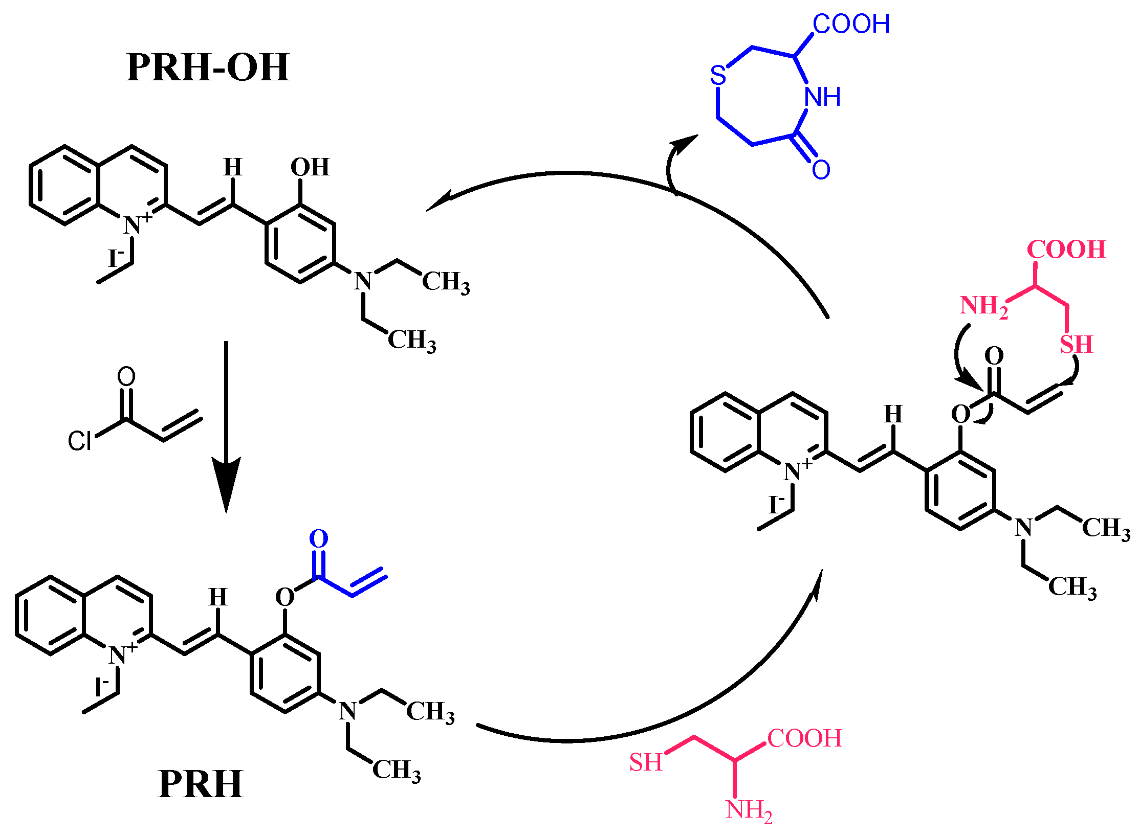 The reaction mechanism of Probe-Cys with Cys is shown in Figure 1. The reaction between the acryloyl group in PRH and cysteine is a typical Michael addition. The thiol group of cysteine acts as a nucleophile and attacks the β-carbon atom of the acryloyl group. The sulfur atom of the thiol provides an electron pair, which undergoes addition with the alkene to form a stable carbon-sulfur bond, thereby generating a thioether adduct. Subsequently, it is dehydrated to form PRH-OH. This reaction has high selectivity and efficiency and is a key reaction in biological coupling and protein modification.