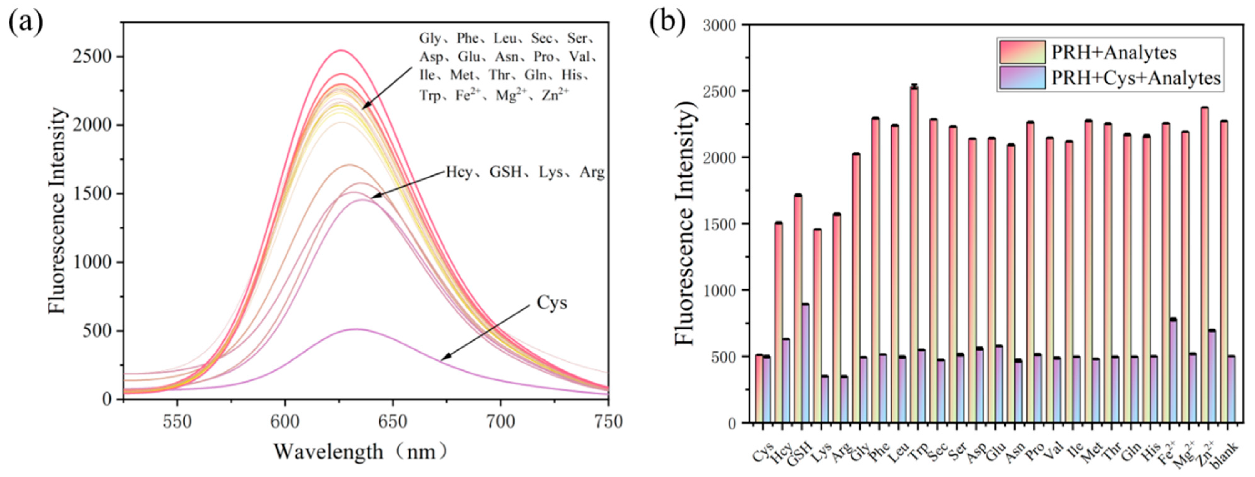 To evaluate the practical feasibility of PRH for Cys detection in complex environments and biological systems, we assessed its selectivity. As shown in Figure 3a, when PRH reacted with other analytes at the same time, the fluorescence intensity hardly changed compared with the control group, which included metal cations (Fe2+, Mg2+, Zn2+), amino acids (Cys, Gsh, Hcy, Ser, Gly, Trp, His, Phe, Leu, Sec, Asp, Glu, Thr, Gln, Lys, Asn, Pro, Val, Ile, Arg, Met), and some mercaptan substances (GSH, Hcy). Compared with the control group, the fluorescence intensity of PRH was significantly reduced after reaction with Cys. All the results indicated that PRH had high selectivity for Cys and could distinguish Cys from other thiols (GSH, Hcy) with similar physiologic properties. Through the color of the solutions under ultraviolet and visible light (Figure S16), it can also be intuitively observed that PRH exhibits high selectivity for Cys.