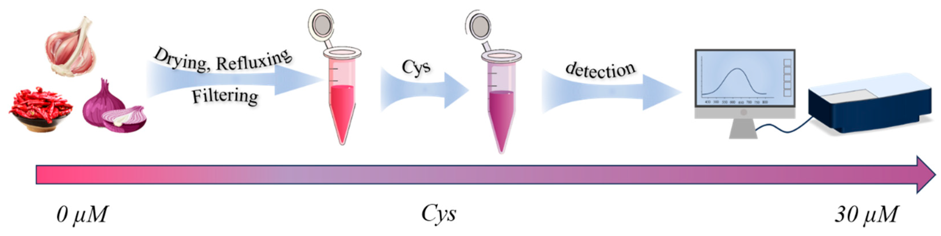 - Yang, Y.; Zhao, C.; Chen, X.; Yang, S.; Zhang, R.; Wang, Y.; Wang, K.; Qian, J.; Long, L. Development of near-infrared fluorescent sensor and portable measuring device for on-site quantitation of Cys in food samples. Sens. Actuators B Chem. 2024, 414, 135953. [Google Scholar] [CrossRef]