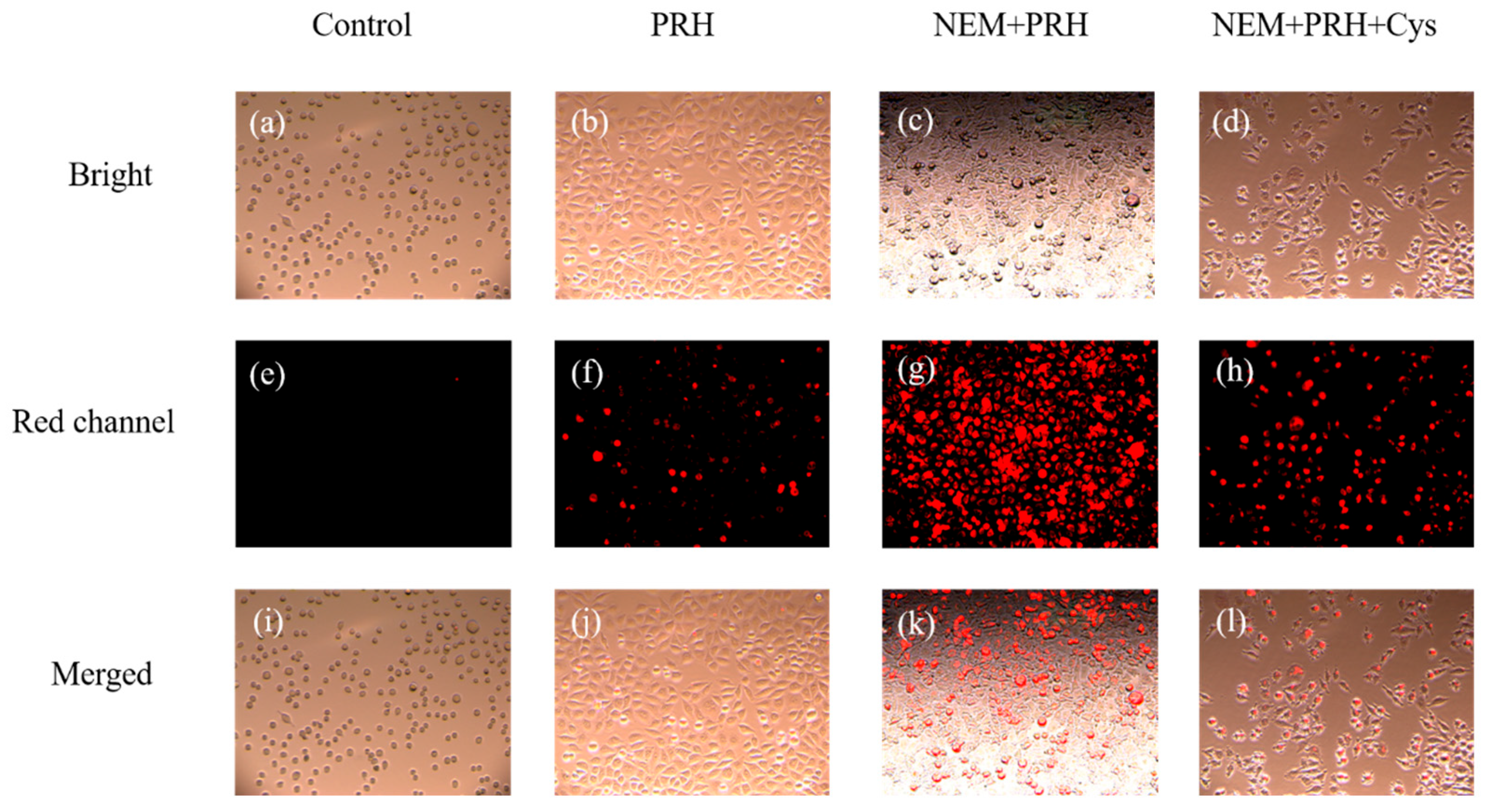 Fluorescence imaging of endogenous and exogenous Cys in HeLa cells. First line: Bright field images; Second line: Red channel images; Third line: Merged images. (a,e,i) HeLa cells were not subjected to any pretreatment; (b,f,j) HeLa cells were co-cultured with PRH; (c,g,k) HeLa cells were cultivated with NEM and PRH was added for co-incubation; (d,h,l) HeLa cells were pretreated with NEM, incubated with PRH, and Cys was added.