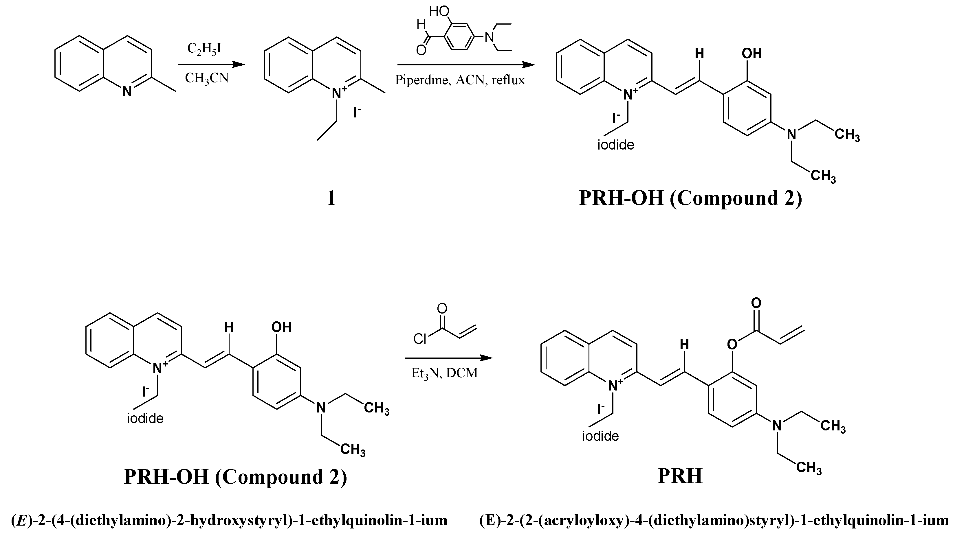 The synthetic route of the probe is depicted in Scheme 1. Under an argon atmosphere, 2-methylquinoline and ethyl iodide were mixed in anhydrous acetonitrile and reacted at 85 °C to obtain Compound 1. Compound 1 was then further reacted with 4-(Diethylamino) salicylaldehyde to afford PRH-OH. Under basic conditions, the hydroxyl group of PRH-OH modify with acryloyl chloride, eventually resulting in the formation of the probe. The detailed information has been described in the Supporting Information. The chemical structures of Compound 1, PRH-OH, and (E)-2-(2-(acryloyloxy)-4-(diethylamino)styryl)-1-ethylquinolin-1-ium (PRH) were characterized by the MS, 1H NMR, and 13C NMR (Figures S1–S9).