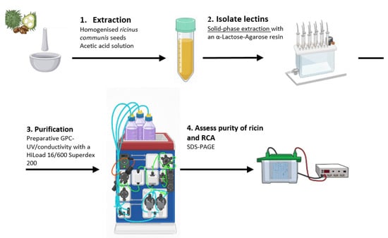 Ricin and RCA120 were extracted from seeds of R. communis according to a published method [5,40]. Briefly, seeds were decorticated and extracted with an acetic acid solution under shaking. The mixture was then filtered, the solid residue was washed with acetic acid solution and hexane was used to separate the oily component. The aqueous phase was saturated with ammonium sulphate to promote protein precipitation. To isolate ricin and RCA120 from the other protein constituents in the crude extract of R. communis, SPE with an α-Lactose-Agarose (LA) commercial resin [41] was used. The eluates from SPE treatment were concentrated using Centrifugal Filter Units (Amicon® Ultra–15 mL–10K) by spinning at 1700 RCF for 20 min. Ricin and RCA120 were purified from this last solution by preparative GPC-UV/conductivity using a HiLoad 16/600 Superdex 200 column with PBS as the eluent, resulting in two distinct, pure fractions. These fractions were analysed for purity through 10× Tris/Glycine SDS-PAGE, followed by staining with Coomassie Brilliant Blue. The protocol is illustrated in Figure 1.