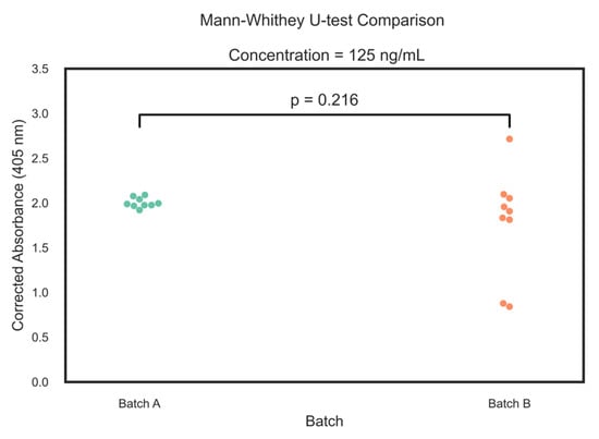 The intra-day performance successfully met these criteria. However, inter-day precision exceeded the 20% threshold for the lowest calibrators. This finding is consistent with the known behaviour of the Enzyme-Linked ImmunoSorbent Assay (ELISA) at low concentrations, where a lower signal-to-noise ratio amplifies small, cumulative fluctuations in environmental conditions, operator technique, and ELISA kit stability [24]. Crucially, all calibration levels met the bias criterion. Therefore, the method is considered suitable for quantitative applications within the validated range, particularly when low-end measurements are performed within the same analytical day. This conclusion was reinforced by the analysis of two independent batches of nine replicates at the highest calibration point (125 ng/mL), where no significant difference was found (p > 0.05). The full results are presented in Table 1.