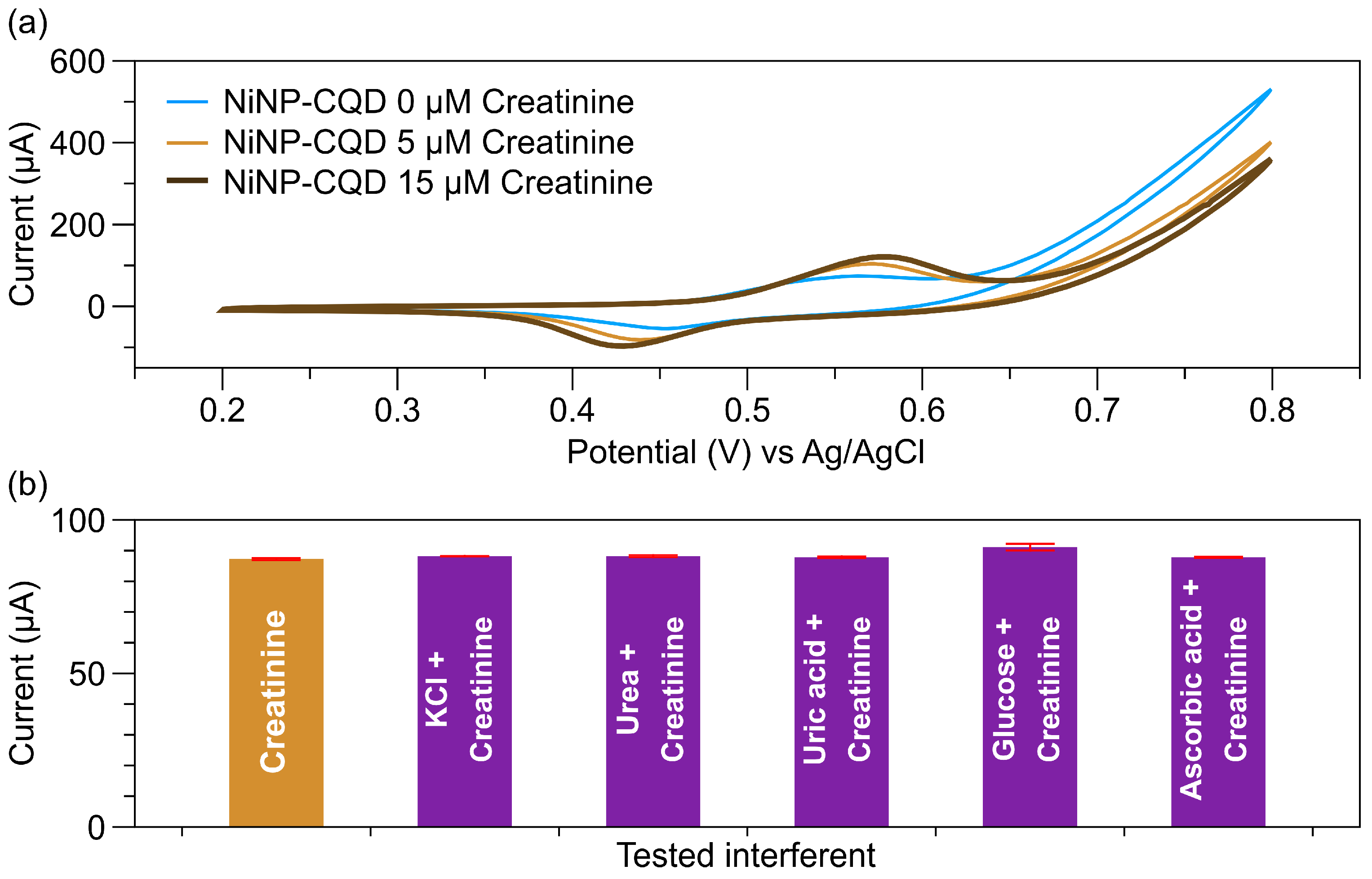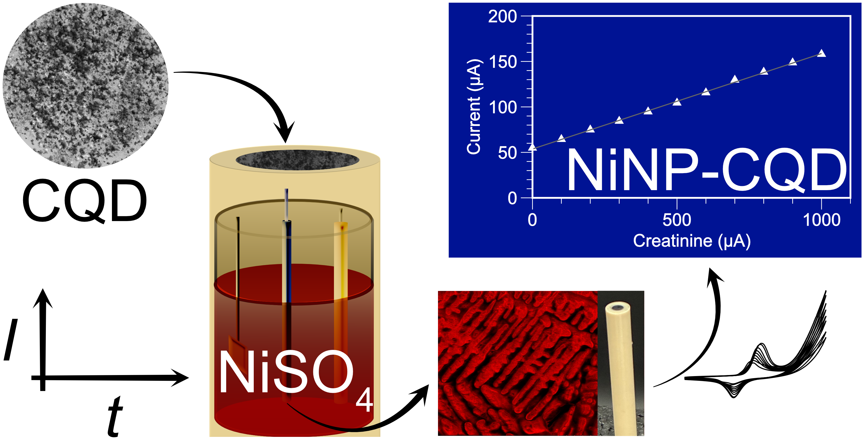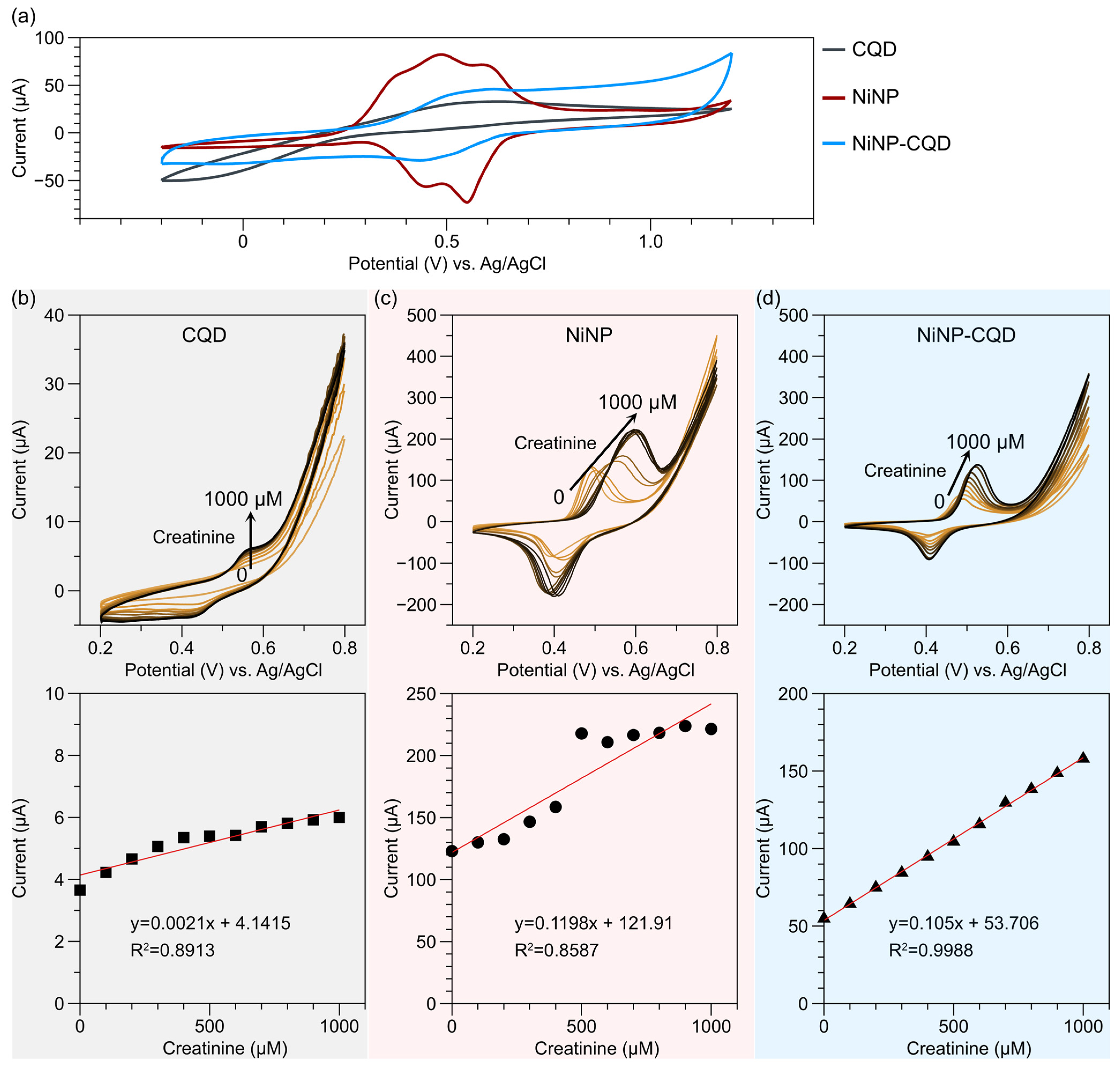 The NiNP–CQD electrode exhibited a linear working range of 10–1000 µM for the NiNP–CQD electrode. The analytical signal corresponded to the anodic peak current of creatinine oxidation (