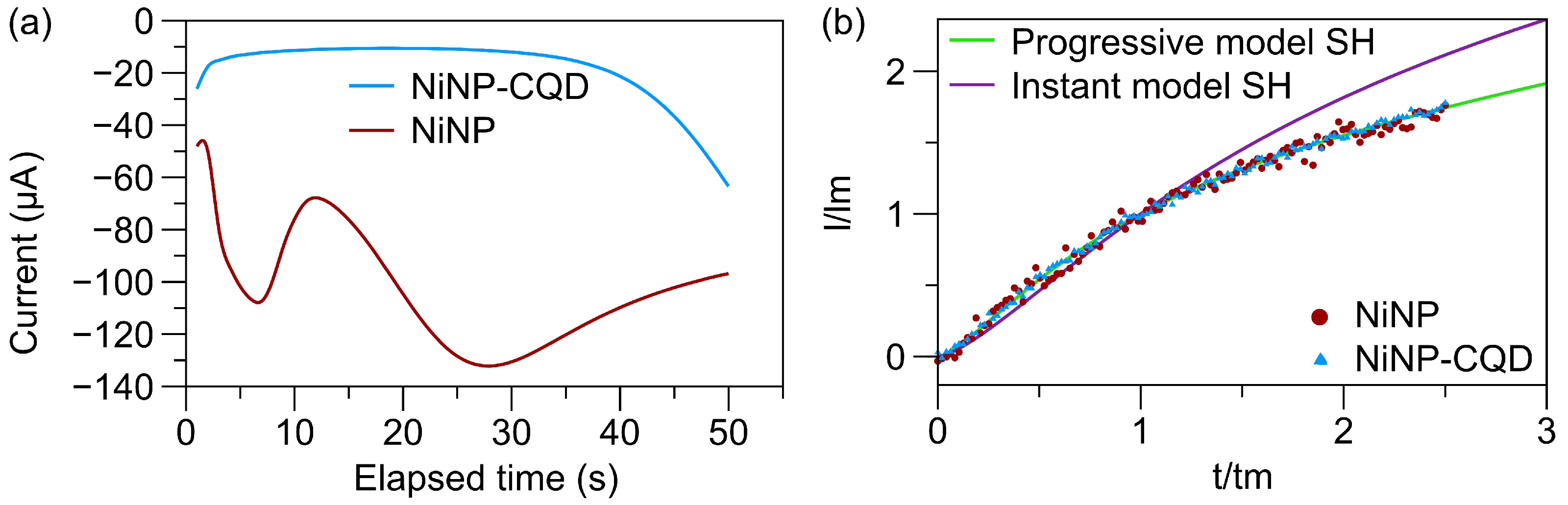 Figure 3b) were analyzed using the Scharifker–Hills (SH) model to elucidate the nucleation and growth mechanism of nickel electrodeposition on both the bare (NiNP) and the CQD-modified electrodes (NiNP–CQD). After normalizing the current-time curves (
