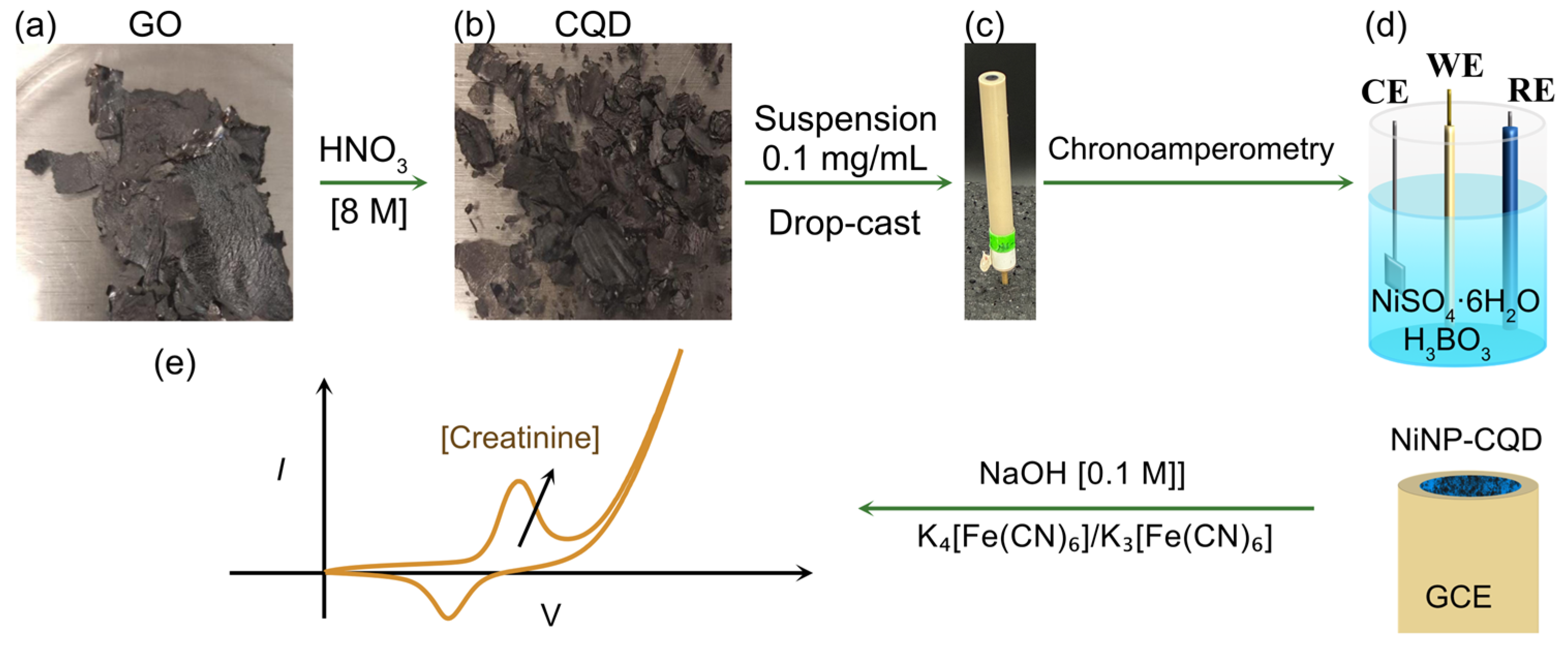 In this work, we report an emerging hybrid non-enzymatic electrochemical platform based on CQDs and NiNPs for the detection of creatinine, a clinically essential biomarker. Here, the “non-enzymatic” term refers to a direct, label-free electrochemical process in which creatinine undergoes oxidation at the catalytic NiOOH/Ni(OH)2 surface without the use of enzymes or mediators. Within this architecture, CQDs provide a conductive and hydrophilic matrix that enables adsorption and interaction with creatinine, NiNPs supply abundant redox-active sites, and the CQD–Ni interface enhances charge-transfer efficiency. By coupling these attributes, the resulting NiNP–CQD hybrid offers improved sensitivity, an expanded linear range, and enhanced stability, aligning with the analytical requirements for point-of-care assessment of renal function.