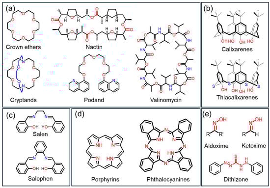 Classification of ionophores by chemical structure: (a) macrocycles (crown ethers, cryptands, nactin, valinomycin) and podand (b) calix- and thiacalixarenes, (c) Schiff bases (salen/salophen), (d) porphyrins/phthalocyanines, and (e) oxime/dithizone derivatives.