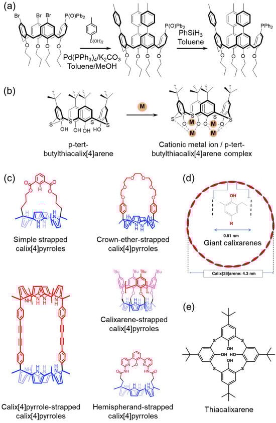 Synthetic advancements now enable giant calixarene formation, where the phenolic repetition unit count can be tailored from ~17 to ~90. The formation of larger macrocycles is favored by heavier alkali bases (e.g., RbOH and CsOH), increased base/phenol ratios, specific processing conditions, and solvent polarity. These variables allow the precise modulation of cavity geometry to meet the requirements of ion capture or transport applications (Figure 3d) [52].