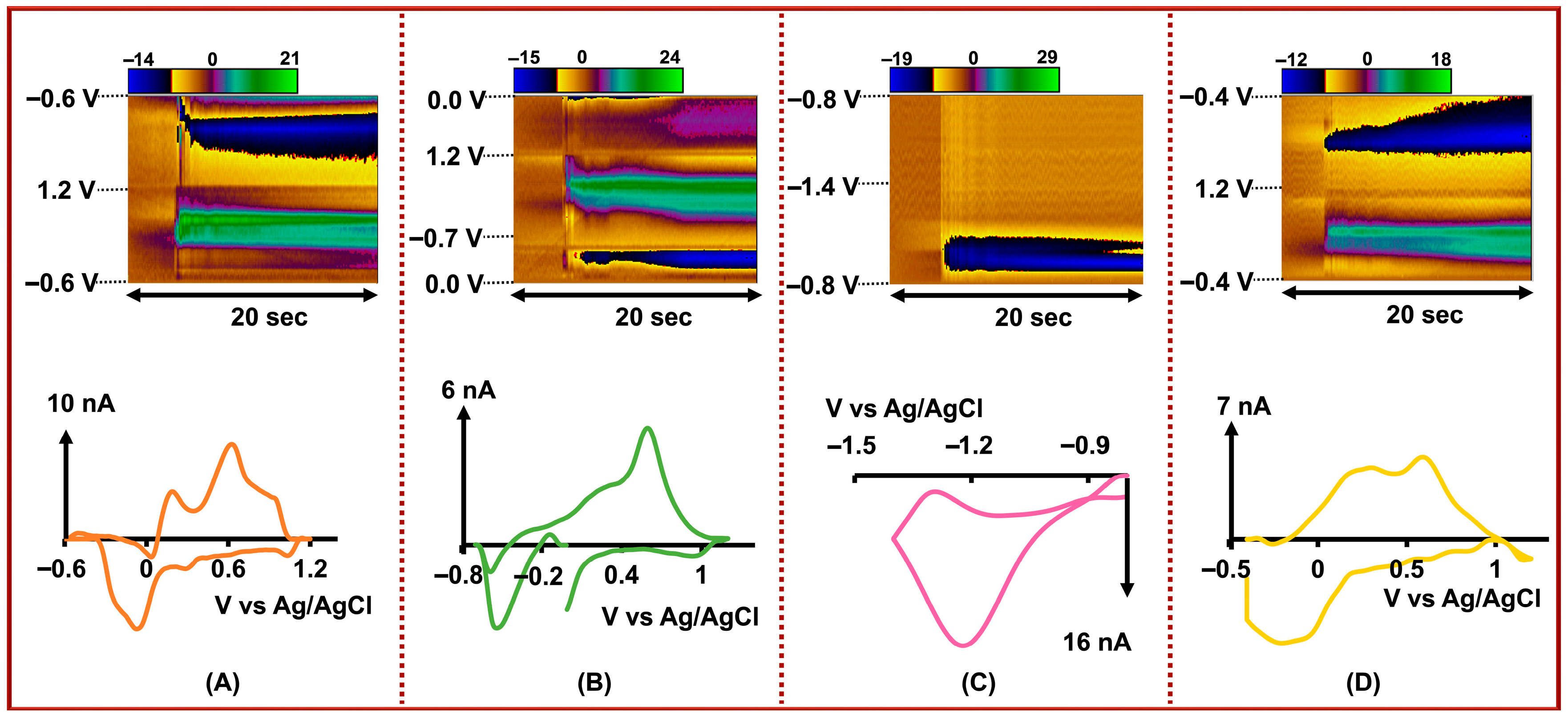 Simultaneous detection of DA, AA, 5-HT, and 5-HIAA using a four-bore CFM. Top row: Representative color plots showing electrochemical responses of (A) DA (0.1 µM) detected on a Nafion-coated electrode, (B) DA + AA (AA, 1.0 µM) on a bare electrode, (C) 5-HT (0.1 µM) on a Nafion-coated electrode, and (D) 5-HT + 5-HIAA (5-HIAA, 1.0 µM) on a bare electrode. Bottom row: Corresponding CVs for (A) DA, (B) DA + AA, (C) 5-HT, and (D) 5-HT + 5-HIAA, obtained by simultaneously applying the DA and 5-HT waveforms across the four electrodes for multi-analyte detection.