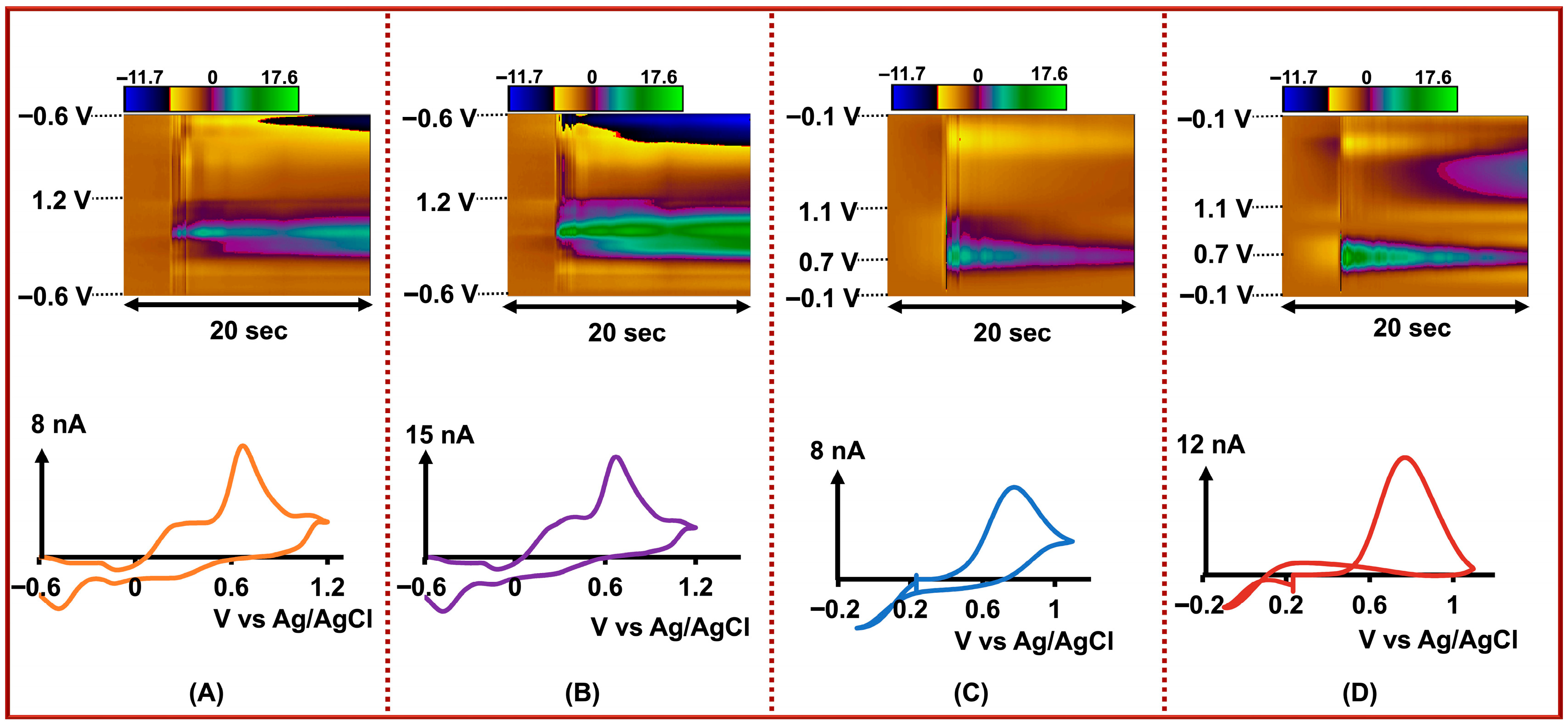 Top row: Representative color plots showing the simultaneous detection of (A) DA, 0.5 µM, (B) Cu2+, 2.0 µM, (C) Cd2+, 0.01 µM, and (D) As3+, 1.0 µM. Bottom row: Corresponding CVs for each analyte extracted from the color plots. All measurements were obtained simultaneously using our four-bore CFM system with individually applied, optimized FSCV waveforms for each analyte.
