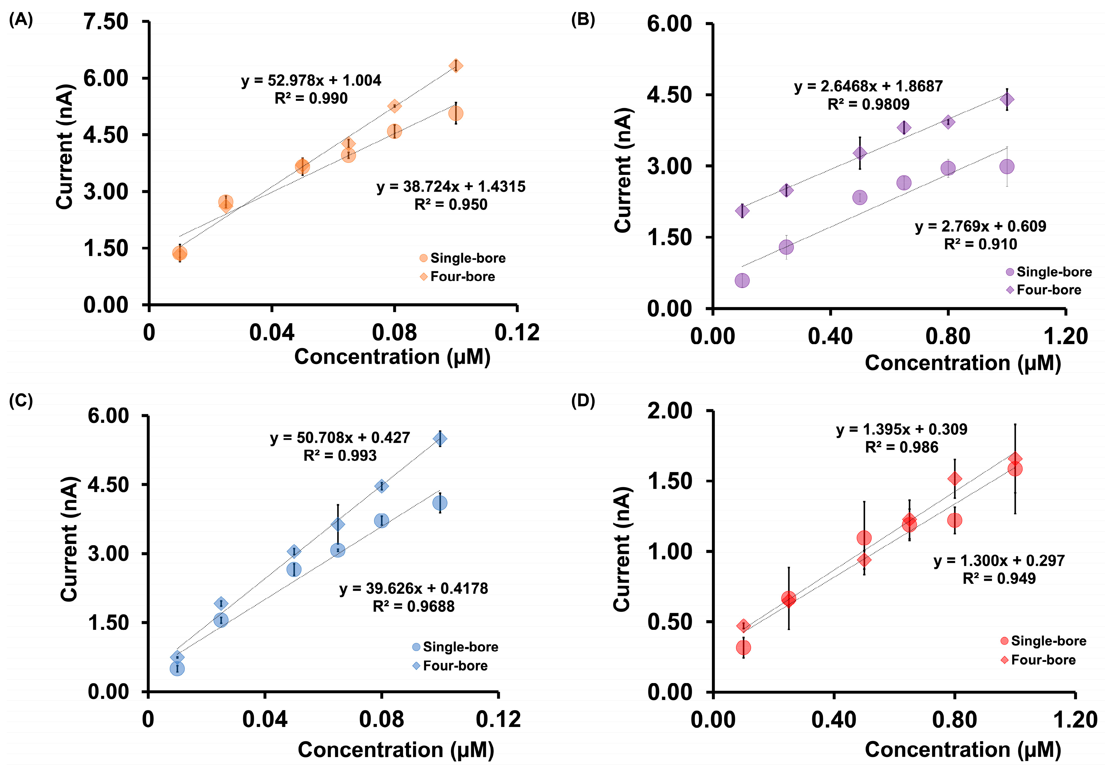 Comparison of calibration curves for mixtures of (A) DA, (B) AA, (C) 5-HT, and (D) 5-HIAA in tris buffer using four-bore CFMs (diamonds) and single-bore CFMs (circles). The current response for AA was obtained by subtracting the DA-only signal (measured on a Nafion-coated fiber) from the combined DA + AA signal (measured on a bare carbon fiber). Similarly, the 5-HIAA response was derived by subtracting the 5-HT-only signal (measured on a Nafion-coated fiber) from the combined 5-HT + 5-HIAA signal (measured on a bare fiber).