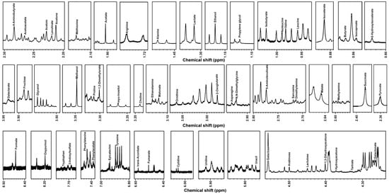 As shown in Figure 1, a total of 61 water soluble molecules were detected by 1H-NMR, including alcohols and polyols (5), amino acids, peptides, and analogues (15), carbohydrates and carbohydrate conjugates (4), organic acids and derivatives (21), and miscellaneous (16), as shown in Table S1.