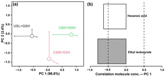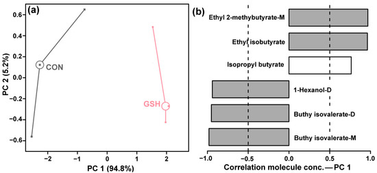 A clear and significant separation between CON group and GSH group was observed along PC1 in the scores plot (Figure 3a). PC1 captured a dominant 94.8% of the total variance, indicating that the addition of g-IDY alone induced a profound and comprehensive shift in the volatile composition of KW. PC2 accounted for a minor portion (5.2%) of the variance. The loadings plot for PC1 (Figure 3b) revealed the specific aroma-active compounds driving this separation.