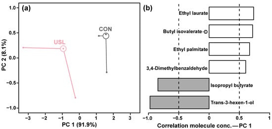 GC-MS and GC-IMS confirmed the substantial impact of ultrasonic maceration on the volatile composition of KW. PCA revealed a clear separation between CON and USL groups along PC1, which accounted for 91.9% of the total variance (Figure 5a). PC2 explained an additional 8.1% of the variance.