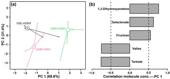PCA model based on the molecules showing significant differences between GSH and CON. In the score plot (a), the two groups of samples are represented by squares (CON), circles (GSH). Wide, empty circles represent the median for each group. The loadings plot (b) shows the importance of each molecule in determining the position of the samples in the score plot. Gray bars indicate significant correlations (p < 0.05) between the molecule’s concentrations and their importance over PC 1.