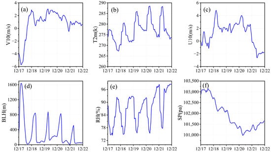 Hourly time series of meteorological variables during the study period: (a) V10; (b) T2m; (c) U10; (d) BLH; (e) RH; and (f) SP.