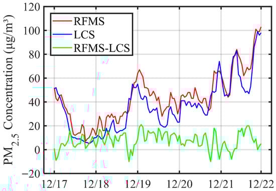 Scatter plot comparing the RFMS and LCS observations of PM2.5 concentrations.