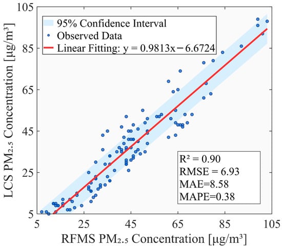 Figure 4 illustrates the scatter plot comparing the PM2.5 concentrations measured by the RFMS and LCS. A strong linear correlation was observed between the two datasets (R2 = 0.90), indicating that the LCS measurements closely followed the variations recorded by the reference instrument. The fitted regression line (y = 0.9813x − 6.6724) shows a slope close to unity, suggesting that the LCS can effectively capture the magnitude and trend of PM2.5 concentrations with only a minor systematic underestimation. The relatively narrow 95% confidence interval (shaded region) further confirms the consistency between the two measurements across the observed concentration range. In terms of quantitative performance, the RMSE and MAE were 6.93 µg/m3 and 8.58 µg/m3, respectively, reflecting good overall agreement between the LCS and the RFMS measurements. The MAPE was 0.38 (equivalent to 38%), indicating that, on average, the LCS deviated from the reference measurements by approximately 38%. This level of accuracy is within the acceptable range for low-cost PM2.5 sensors and demonstrates that the LCS provides a reliable estimation of ambient PM2.5 concentrations under most conditions even without calibration.