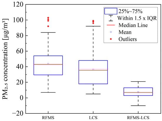 Figure 5 shows the boxplots of PM2.5 concentrations measured by the RFMS and LCS, along with the distribution of their differences (RFMS–LCS). The boxes represent the interquartile range (25th–75th percentile), the horizontal red line denotes the median, the small square indicates the mean, and whiskers extend to 1.5 times the interquartile range (IQR). Red diamonds represent outliers. Overall, RFMS and LCS datasets exhibit similar distribution patterns, suggesting that the LCS effectively captures the temporal variations in PM2.5 levels. However, the LCS tends to slightly underestimate PM2.5 concentrations relative to the RFMS, as indicated by the lower median and mean values. The difference distribution (RFMS–LCS) further illustrates this bias, with most values clustered near zero and a small positive median and mean, implying a systematic underestimation by the LCS. The narrow interquartile range of the difference plot indicates good consistency between the two measurements for the majority of data points, while a few high outliers reflect occasional deviations at higher concentration levels.