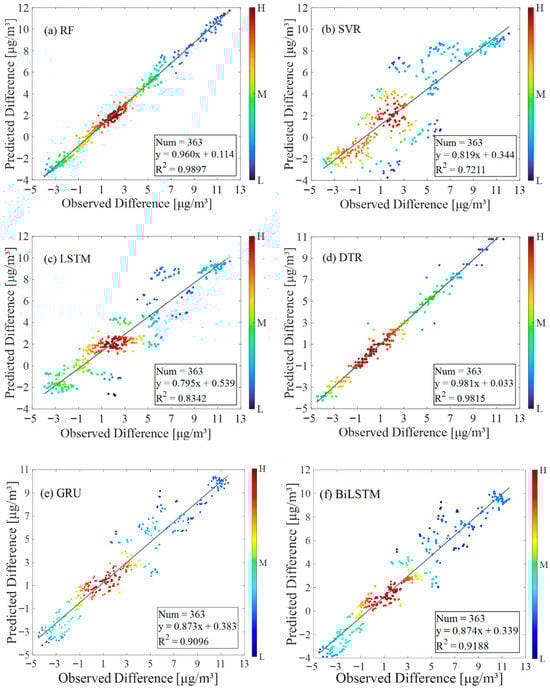 Scatter plots comparing the observed and predicted PM2.5 concentration differences for the training dataset using six ML algorithms: (a) RF, (b) SVR, (c) LSTM, (d) DTR, (e) GRU, and (f) BiLSTM.