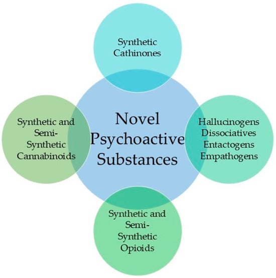 In this review, a simplified classification was adopted, with NPSs separated into four groups: synthetic and semi-synthetic cannabinoids; synthetic cathinones; synthetic and semi-synthetic opioids; and hallucinogens, dissociatives, entactogens, and empathogens (Figure 1). These four groups represent the most frequently identified NPS families between 2020 and 2025 and form the structural basis for the organization of the subsequent sections. Synthetic and semi-synthetic cannabinoids constitute one of the largest and most chemically diverse groups, comprising indole-, indazole-, and cyclohexyl-derived receptor agonists, as well as emerging semi-synthetic products such as hexahydrocannabinol (HHC) and tetrahydrocannabiphorol (THCP). Synthetic cathinones form the second major class and include β-keto analogues of amphetamine with extensive structural variation through aromatic substitution, alkyl-chain extension, and N-functionalization. Synthetic and semi-synthetic opioids, ranging from fentanyl analogues to benzimidazole derivatives and modified pharmaceutical opioids, represent a smaller but disproportionately high-risk group due to their potency and frequent implication in fatal intoxications. Finally, a heterogeneous category of hallucinogens, dissociatives, entactogens, and empathogens encompasses novel tryptamines, phenethylamines, arylcyclohexylamines, and MDMA-like substances, many of which appear only sporadically yet require analytical workflows capable of distinguishing closely related positional or stereochemical isomers.