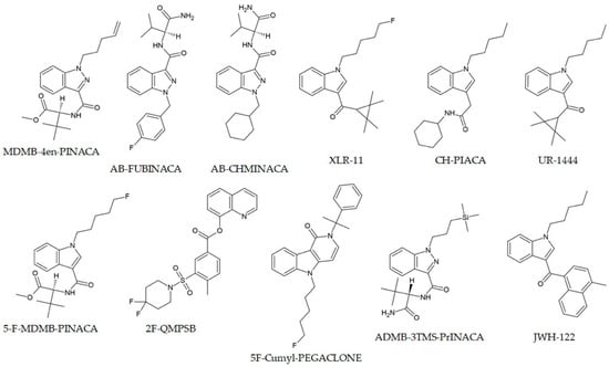 Recent studies have emphasized the diversity of SC formulations and matrices, such as paper, fabrics, and herb materials [84]. Low-THC cannabis or “CBD weed” is an industrially grown hemp. Most EU countries have an upper limit of allowed THC in these products of 0.2%. Several alerts have been issued in EU countries for the presence of synthetic cannabinoid MDMB-4en-PINACA (Figure 2) in low-THC products [85]. Out of 1142 examined in the article by Oomen and coworkers, 270 were found to contain this compound by GC-MS, and further proven by UPLC-QTOF [86]. Al-Eitan et al. investigated seized herbal blends from the Jordanian market, successfully quantifying AB-FUBINACA, AB-CHMINACA, and XLR-11 (all of which are presented in Figure 2) using GC-MS following liquid–liquid extraction, and highlighting wide variability in concentrations across samples [87] (Table 1). Similar findings were reported in Europe, where Pasin and colleagues identified CH-PIACA, a newly emerged indole-3-acetamide cannabinoid, in seized powders using combined GC-MS and high-resolution MS [88].