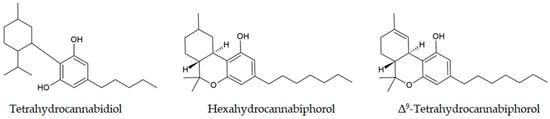 A special group of compounds, semi-synthetic cannabinoids (SSCs), is obtained by chemical modification of phytocannabinoids. The first SSC was (-)-trans-∆8-THC, discovered in the U.S. market in 2019 [127], produced from CBD through a ring closure reaction. Hexahydrocannabinol (HHC) is another SSC that was first reported to the EMCDDA in May 2022. By December 2022, it was found in almost all European countries [128]. These hexahydro derivatives of cannabinol are not scheduled under international drug conventions, which paves the way for their distribution in vape products and edibles [127]. HHC and cannabinol are the products of the thermal reduction and oxidation of tetrahydrocannabiphorol (Δ9-THCP) in e-cigarettes, as observed in the controlled conditions by GC-MS [64]. In the post-COVID-19 period, several other compounds have been determined by generic extraction in methanol and subsequent GC-MS analysis of the seized samples, including tetrahydrocannabidiol (H4-CBD), hexahydrocannabinol acetate (HHC-O-Acetate), hexahydrocannabiphorol (HHCP), and Δ9-THCP [129]. The structures of these compounds are shown in Figure 3. These were found in e-cigarette products (56%), hashish (20%), concentrates (17%), edibles (10%), and plant material (10%). ∆9 -THCP is a heptyl homolog of ∆9-THC, recently found in Cannabis sativa L. [130]. The low amounts in natural sources make it unprofitable for isolation, so it is usually produced by the chemical modification of CBD [131]. The manufacturers of this SSC claim it is derived from natural sources, but its legal status varies from country to country.