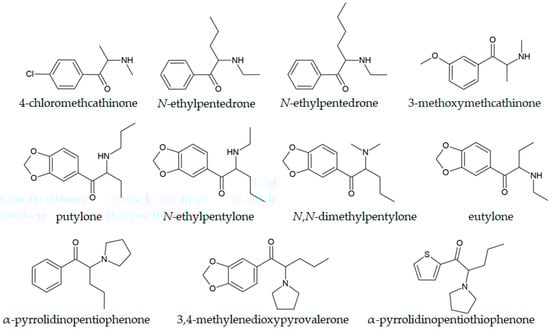 Cathinones are usually produced in clandestine laboratories using procedures described in the scientific literature or patents. Most synthetic cathinones act as stimulants by producing effects similar to cocaine and amphetamine (euphoria, tachycardia, aggressive behavior, etc.) [140]. The origin of their activity lies in their inhibitory effects on dopamine and noradrenaline transporters. They are usually found in crystal or powder form, which allows their oral or nasal administration [31]. These NPSs are usually sold on the internet as “bath salts”, “research chemicals”, and “plant food” [141]. The regulation of synthetic cathinones lags behind the substances sold on the illicit market, as their scheduling is carried out on a case-by-case basis [134]. Therefore, only slight structural modifications of existing compounds are needed to avoid legislative restrictions [134].