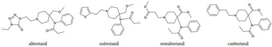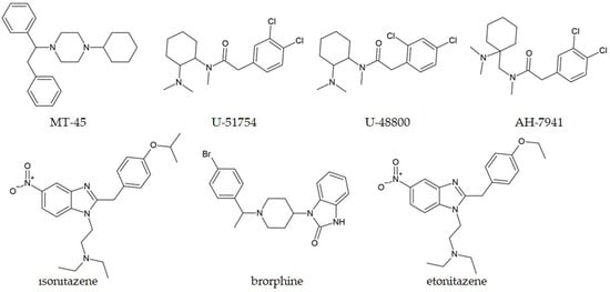 - Solimini, R.; Pichini, S.; Pacifici, R.; Busardò, F.P.; Giorgetti, R. Pharmacotoxicology of Non-Fentanyl Derived New Synthetic Opioids. Front. Pharmacol. 2018, 9, 654. [Google Scholar] [CrossRef]