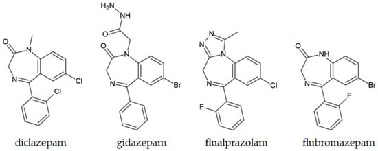 - Maskell, P.D.; Wilson, G.; Manchester, K.R. Designer Benzodiazepines Gidazepam and Desalkygidazepam (Bromonordiazepam): What Do We Know? J. Anal. Toxicol. 2023, 47, 324–331. [Google Scholar] [CrossRef] [PubMed]