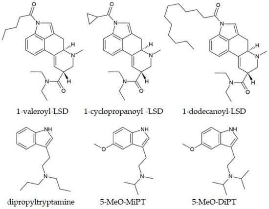 - Neukamm, M.A.; Pollak, S.; Thoma, V.; Vogt, S.; Huppertz, L.M.; Auwärter, V. A Fatal Case of Aspiration Due to Consumption of the Hallucinogenic Tryptamine Derivative Dipropyltryptamine (DPT). J. Pharm. Biomed. Anal. 2024, 240, 115959. [Google Scholar] [CrossRef] [PubMed]