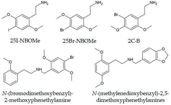 - Kyriakou, C.; Marinelli, E.; Frati, P.; Santurro, A.; Afxentiou, M.; Zaami, S.; Busardo, F.P. NBOMe: New Potent Hallucinogens--Pharmacology, Analytical Methods, Toxicities, Fatalities: A Review. Eur. Rev. Med. Pharmacol. Sci. 2015, 19, 3270–3281. [Google Scholar]