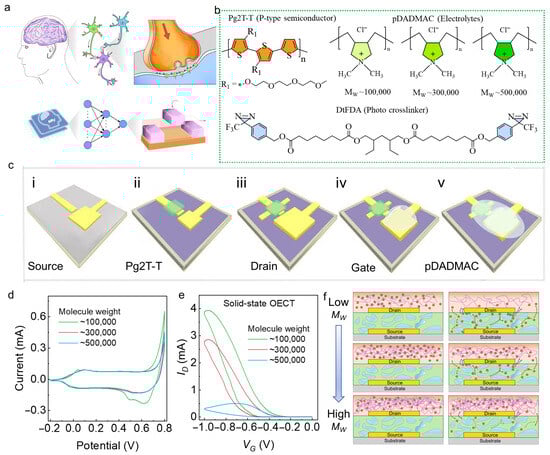 Despite these advances, OECTs based on liquid electrolytes or ionic gels still face fundamental challenges in stability, controllability, and large-scale integration [16,17,18]. The volatility and leakage of liquid electrolytes, together with uncontrolled ionic distributions, compromise device reproducibility and system reliability. Moreover, the difficulty in tailoring ionic transport pathways and relaxation times restricts precise control over synaptic temporal dynamics, such as paired-pulse facilitation, spike rate-dependent plasticity, and long-term potentiation/depression, thereby limiting the implementation of robust learning rules in solid-state neuromorphic architectures [19,20,21]. Achieving reliable bioinspired computation therefore requires precise regulation of ionic transport to deterministically control charge-carrier injection and synaptic weight evolution [22,23]. Polymer electrolytes have recently emerged as an effective route to address these issues. By immobilizing mobile ions within a polymeric host matrix, they create a mechanically robust, leakage-free, and tunable ionic environment while maintaining adequate ionic conductivity for efficient electrochemical gating [24]. The molecular attributes of the polymeric host matrix, such as molecular weight, chain entanglement, and segmental mobility, govern ion diffusion kinetics, doping capacity, and charge retention, all of which critically define synaptic response dynamics [25,26,27,28]. However, most existing studies modulate electrolyte composition or blending ratio to tune device performance, whereas the direct correlation between single-component polymer electrolyte molecular weight and OECT behavior, particularly its impact on neuromorphic synaptic functions, remains largely unexplored.