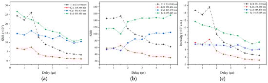 Variation in spectral parameters with delay time: (a) change in characteristic spectral line SNR with delay time; (b) change in characteristic spectral line SBR with delay time; (c) change in characteristic spectral line intensity with delay time.