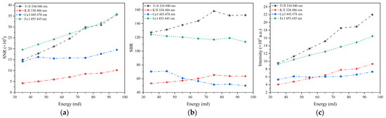 Variation in spectral parameters with single laser pulse energy: (a) change in characteristic spectral line SNR with single laser pulse energy; (b) change in characteristic spectral line SBR with single laser pulse energy; (c) change in characteristic spectral line intensity with single laser pulse energy.