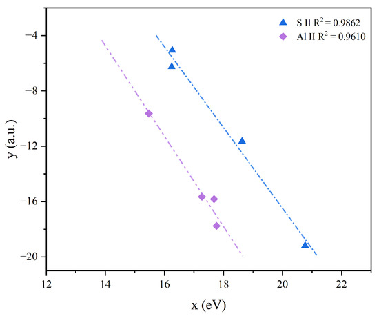 In this study, a total of eight spectral lines of different elements (S and Al) was selected. The relevant information for these spectral lines is shown in Table 2. The energy levels of these spectral lines differ significantly, which is crucial for determining the plasma temperature. The plasma temperature was calculated using the ionic spectral lines of S and Al elements, and the final plasma temperature was obtained by averaging their calculated values. Figure 6 shows the fitting graph of the plasma temperature calculation from a particular test. It can be seen that the goodness of fit (R2) for the S and Al element fitting curves was 0.9862 and 0.9610, respectively, both of which are close to 1, indicating a good fit. The plasma temperatures calculated using the S and Al spectral lines were 3938.5 K and 3625.4 K, respectively. The obtained plasma temperatures are relatively close, and the final plasma temperature was taken as their average value, 3781.95 K.