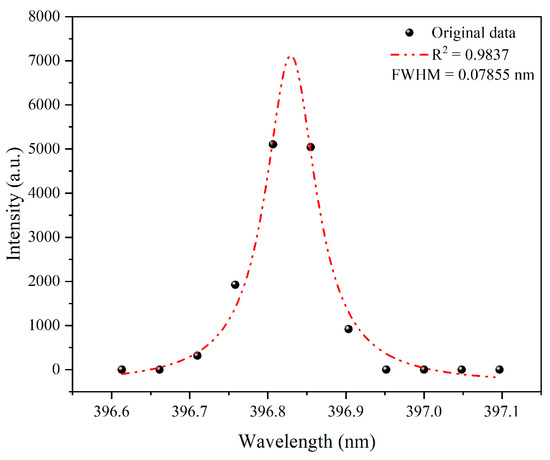 In the formula, w represents the electron collision parameter, and it can be obtained from the Stark database [29], where at 3781.95 K w is approximately 1.62 × 10⁻⁶ Å. denotes the full width at half maximum of the spectral line. The Ca I 396.855 nm spectral line was selected as it is relatively independent and does not exhibit self-absorption phenomena. It has a well-defined profile, and through Lorentz fitting the full width at half maximum was obtained to calculate the electron number density. Figure 7 illustrates the Lorentz fitting results for the Ca I 396.855 nm spectral line from the same LIBS test as that used for calculating the plasma temperature mentioned earlier. The coefficient of determination (R2) for the fitting was 0.9837, indicating an excellent fit, with a full width at half maximum of 0.07855 nm.