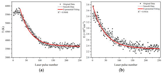LIBS tests were conducted on the samples with a delay time of 1 µs and a single-pulse laser energy of 75 mJ. Under these conditions, spectra with strong line intensities were obtained. A total of 250 tests was performed on the samples, and the plasma temperature of the samples varied with the number of laser pulses, as shown in Figure 8, while the electron density of the samples varied with the number of laser pulses, as illustrated in Figure 9. Due to the fluctuations in LIBS testing and calculation errors, a Savitzky–Golay filter was applied to the raw plasma temperature and electron density data to better identify the trends in plasma parameter variations. This filter can smooth the data without distorting the underlying trends. The plasma parameters (temperature and electron density) gradually stabilized as the number of laser pulses increased. This is primarily attributed to the progressive formation of ablation craters and changes in the interaction mechanism between the laser and the material. In the initial stage, due to the relatively smooth surface of the material, the laser energy can efficiently act on the material’s surface, generating high-temperature, high-density plasma. However, as the number of laser pulses increases, the ablation craters deepen, altering the plasma’s expansion and cooling processes and imposing constraints on its behavior. These constraints slow down the random diffusion of the plasma, leading to a gradual stabilization of its temperature and electron density. As the plasma parameters stabilize, the fluctuations in LIBS signals decrease, thereby improving the repeatability and reliability of the spectral signals. Based on this, the Levenberg–Marquardt optimization algorithm was employed, and an exponential function was selected to fit the curves of plasma parameters as a function of the number of laser pulses, excluding the first 25 data points for plasma temperature fitting. The fitting results indicate a good fit, with a coefficient of determination of 0.9848 for the plasma temperature as a function of the number of laser pulses, and a coefficient of determination of 0.9416 for the electron density as a function of the number of laser pulses.