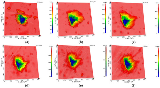Confocal microscope test results: (a–f) show the laser ablation morphology at pulse counts of 10, 50, 100, 150, 200, and 250, respectively.